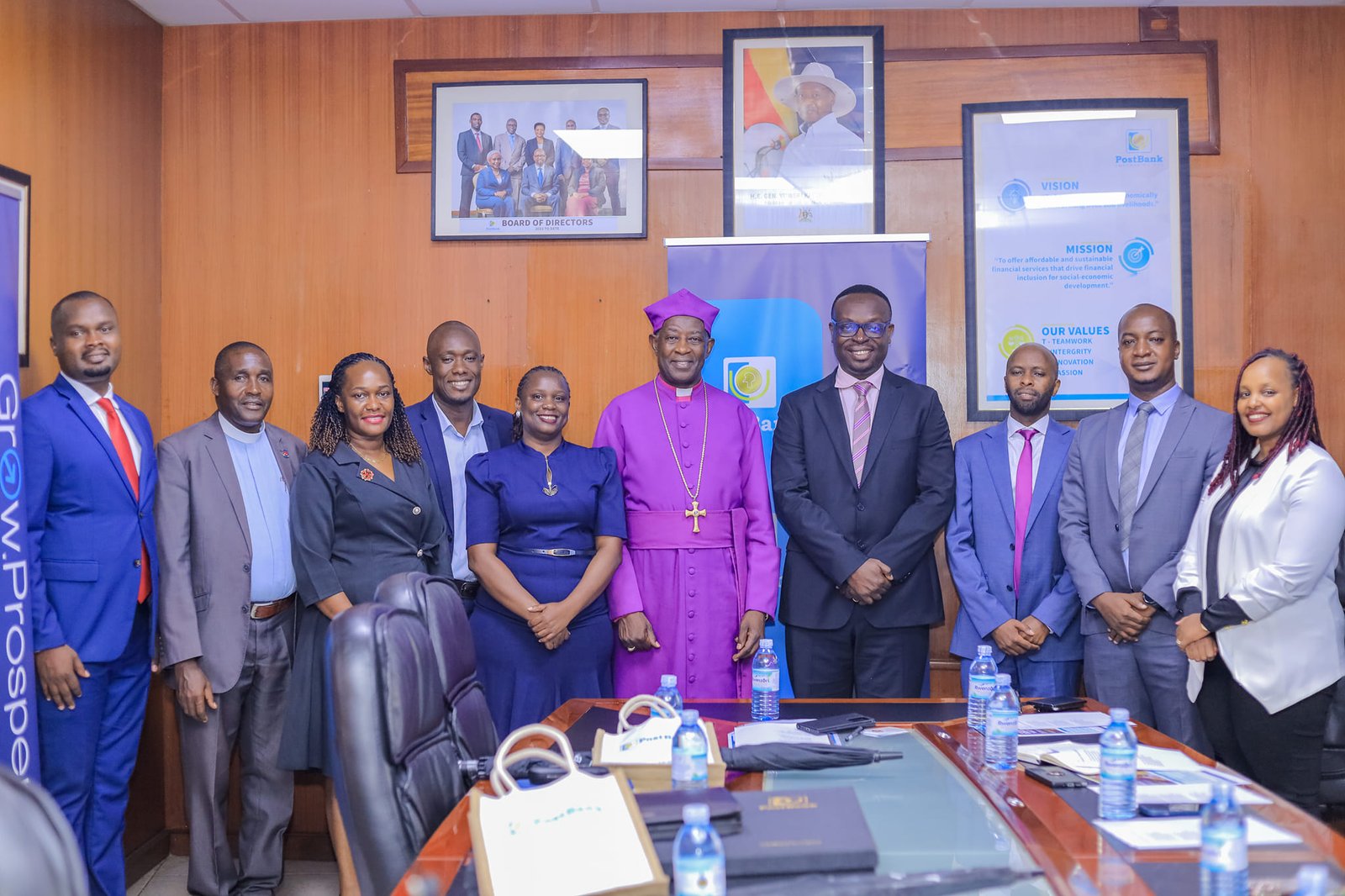 The Archbishop of the Church of Uganda, The Most Rev. Dr. Stephen Samuel Kaziimba Mugalu, has today morning paid a pastoral visit to Post Bank Uganda Headquarters in Kampala. During his visit, he urged the bank to enhance its support for the Church of Uganda’s community transformation initiatives.